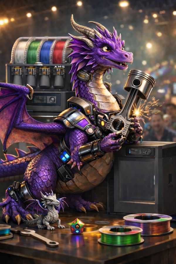 Bambi is the dragon that started it all. Powered by a Bambu P1S with AMS and an upgraded high-flow nozzle, she brings vibrant, multicolor creations to life with speed and precision.